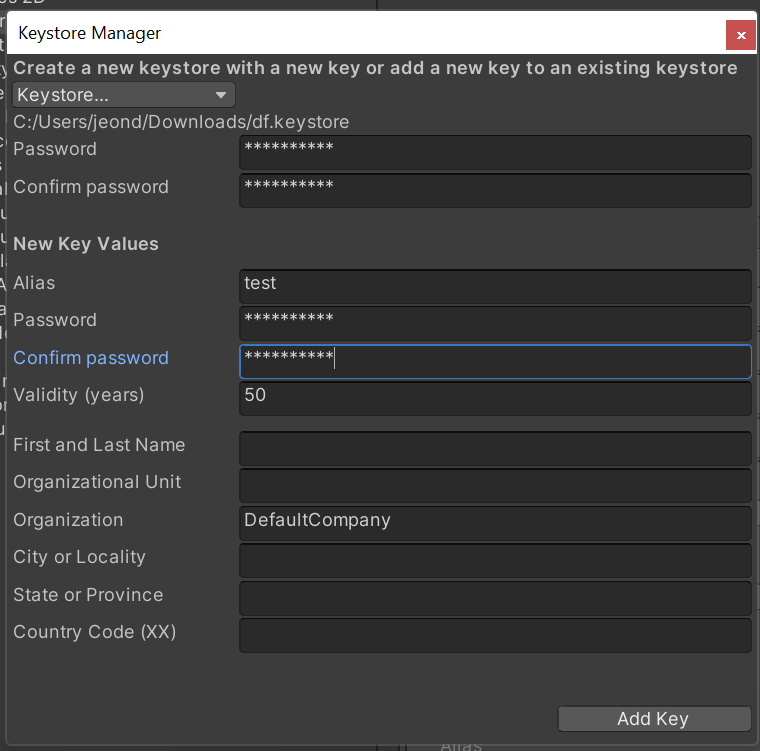2. Player Setting / Player / Publishing / Keystore Manager를 누른 후에 Password를 설정하고 key를 생성한다.