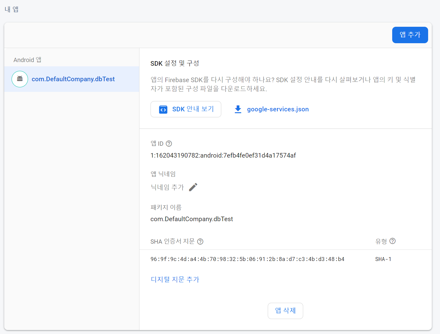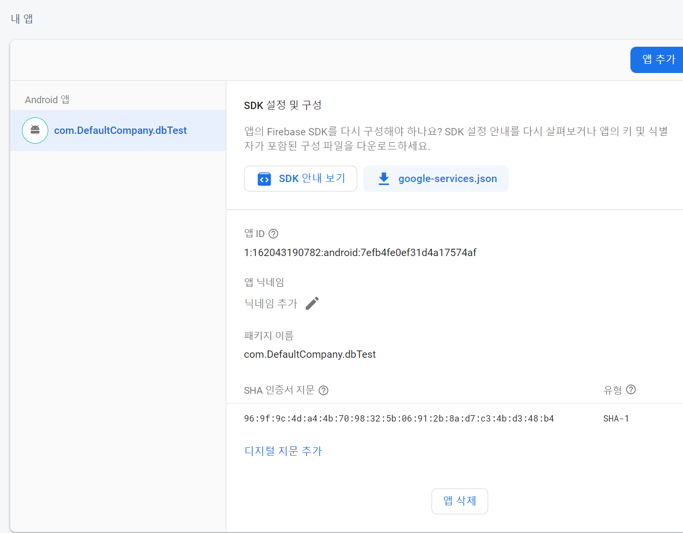 5. 다시 프로젝트 개요 / 프로젝트 설정 / SDK 설정 및 구성에 있는 다운로드 표시되어 있는 google-services.json을 다운 받는다.