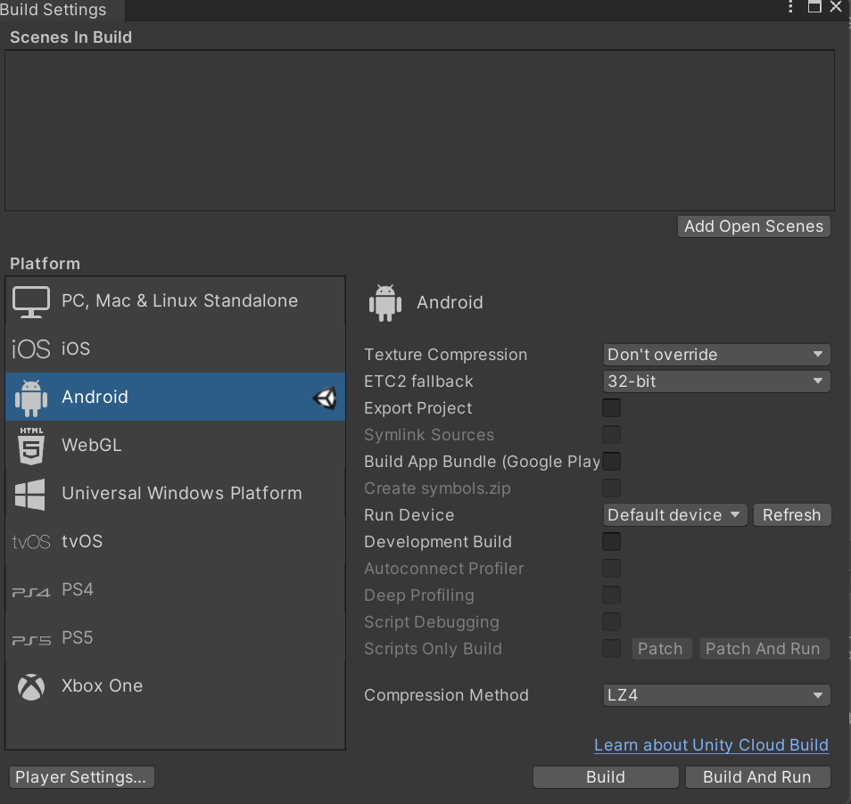 1. 유니티 platform을 Android로 전환한다.